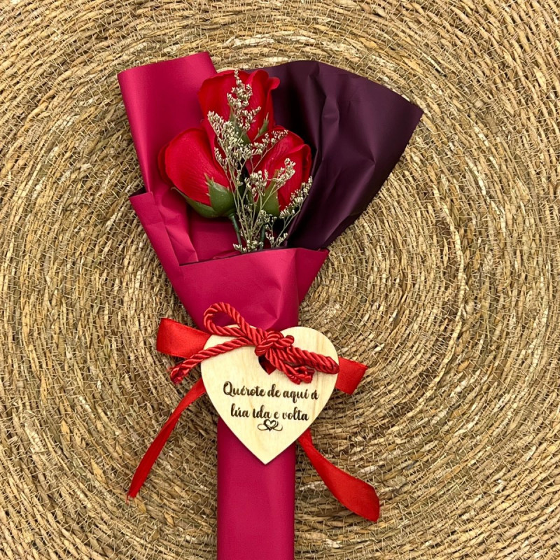 Ramo empaquetado de tres rosas personalizado con corazón de madera de 8 cm.
