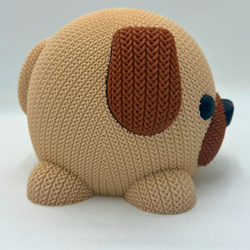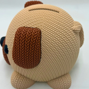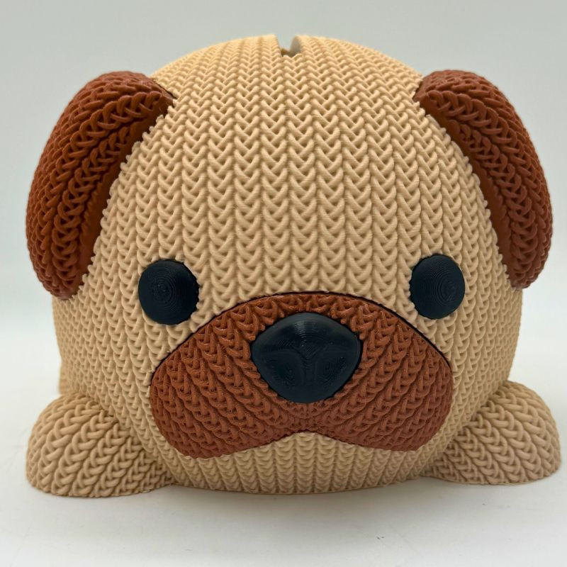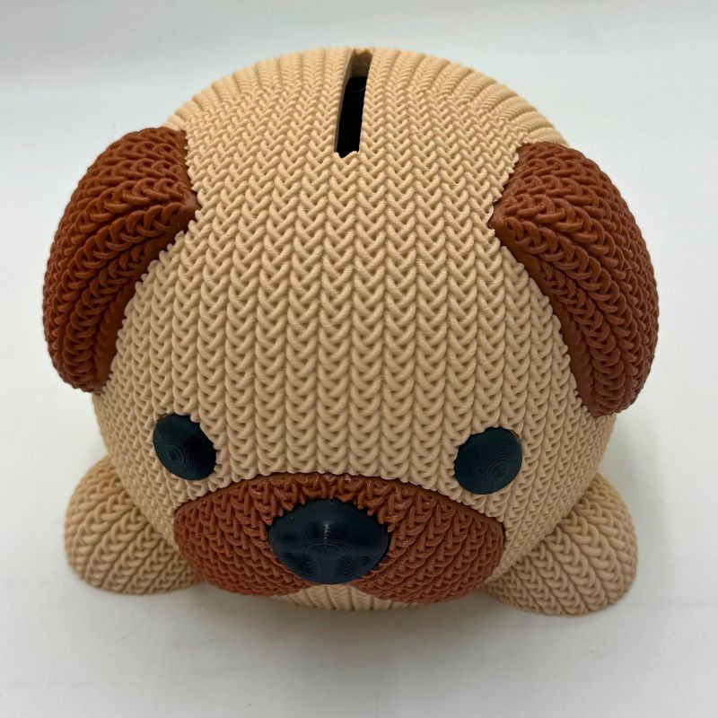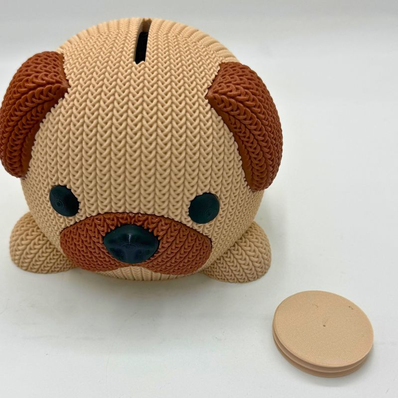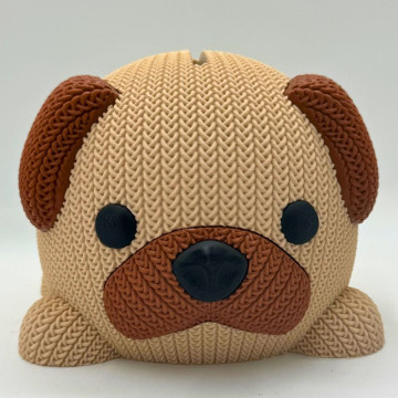 Hucha con forma de perro fabricada en impresión 3D, ideal para ahorrar y decorar. Se puede personalizar con nombre en madera.