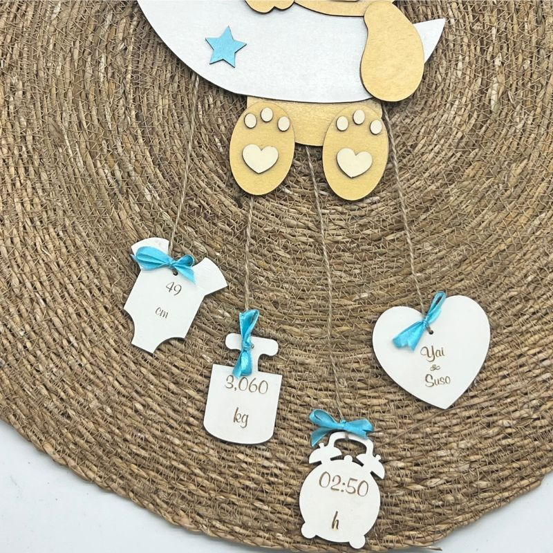 Las medidas aproximadas del osito son de 3mm de grosor, (cuenta con distintas capas, por lo que el grosor va a depender de la zona), mide 29x20 cm (datos natalicios a parte, que irán colgando hacia abajo en diferentes alturas).