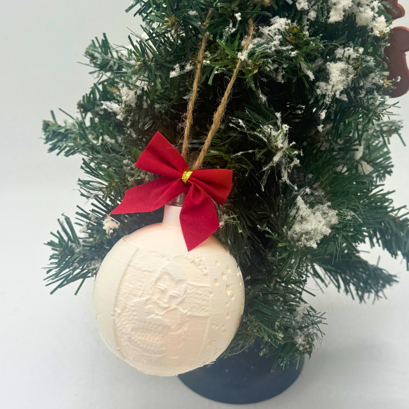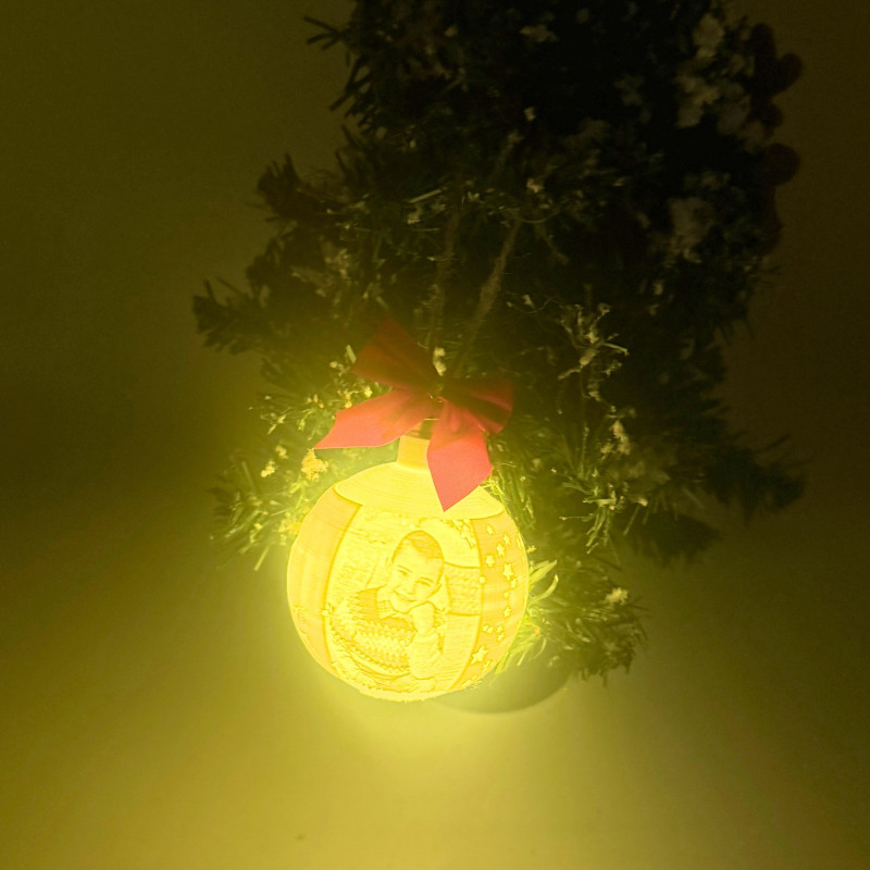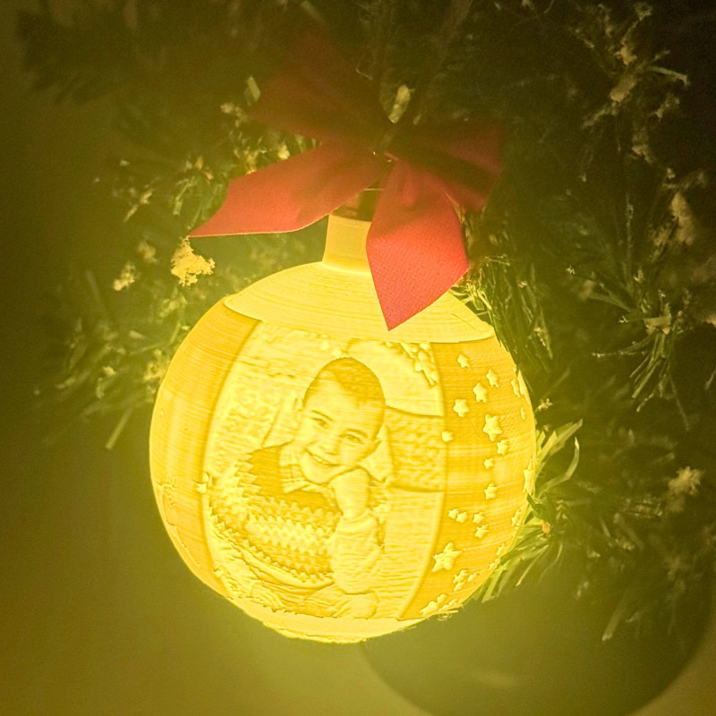 Ilumina tu árbol con un recuerdo único. Nuestra bola navideña personalizada utiliza tecnología de litografía 3D para proyectar tu foto con una luz cálida que realza cada detalle, creando un efecto mágico y especial.