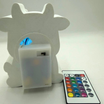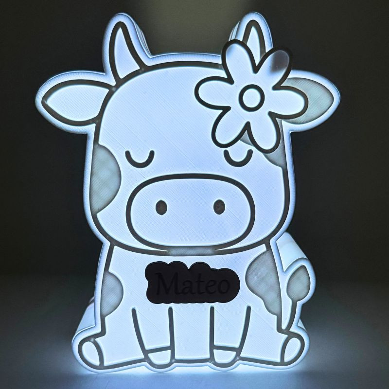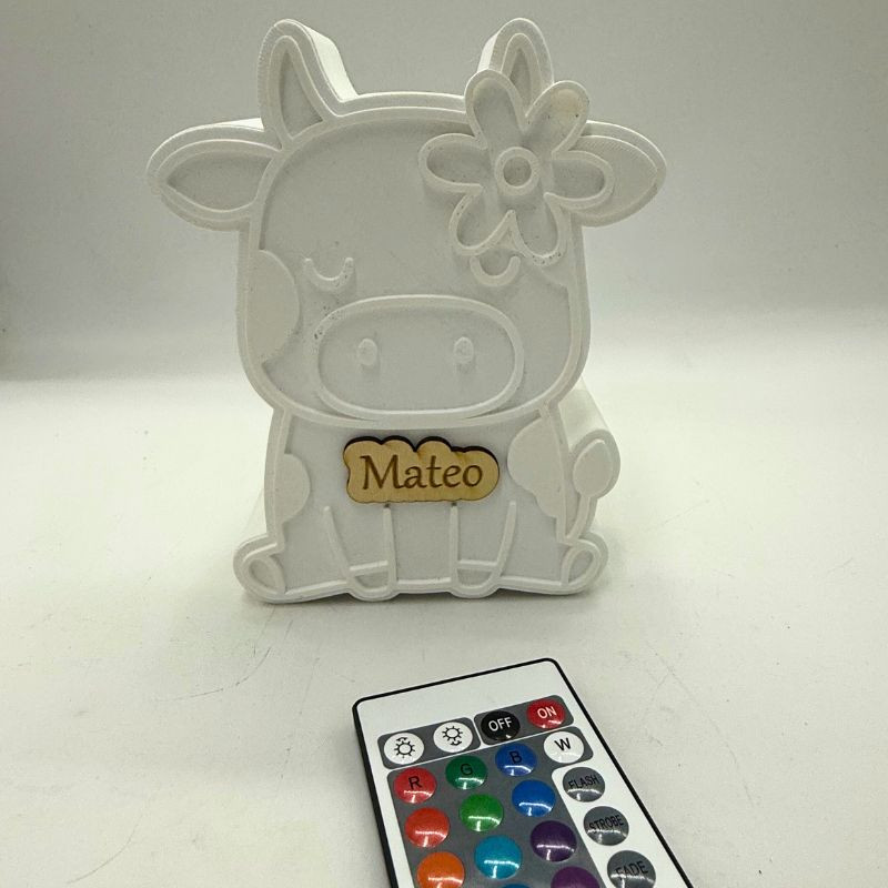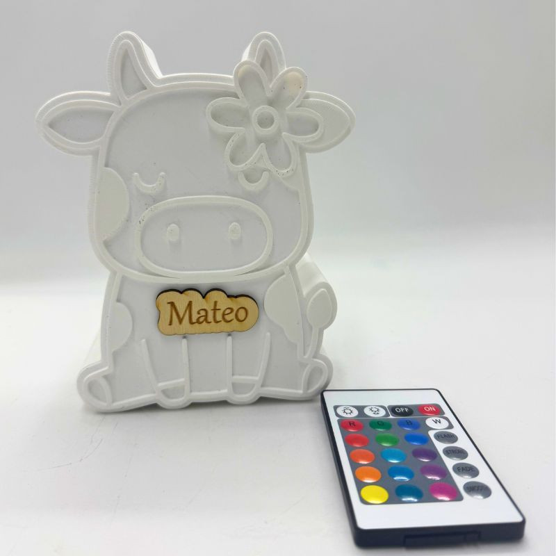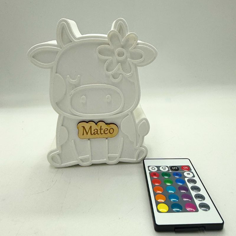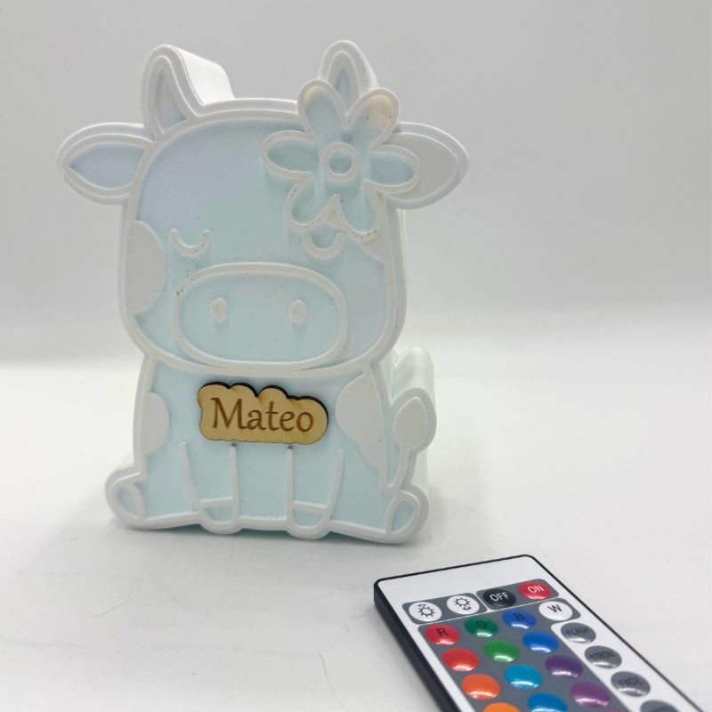 Lámpara personalizada Vaca Mú de 15 x 12 cm, con nombre grabado en madera. Funciona con pilas e incluye mando a distancia para cambiar los colores. Un detalle único y decorativo, perfecto como regalo personalizado.