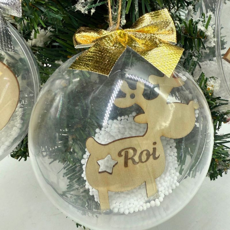 No olvides guardar tu personalización para poder agregar al carritoBola de Naviad de 8cm de diámetro en la que dentro va un reno de madera personalizad.