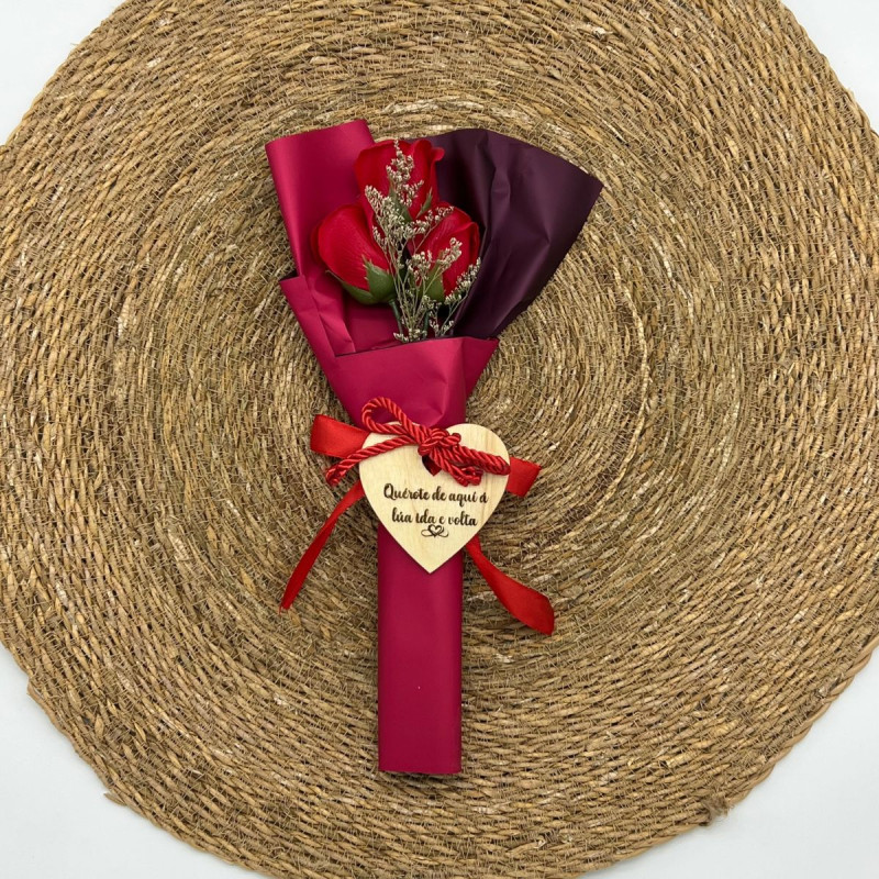 Ramo empaquetado de tres rosas personalizado con corazón de madera de 8 cm.